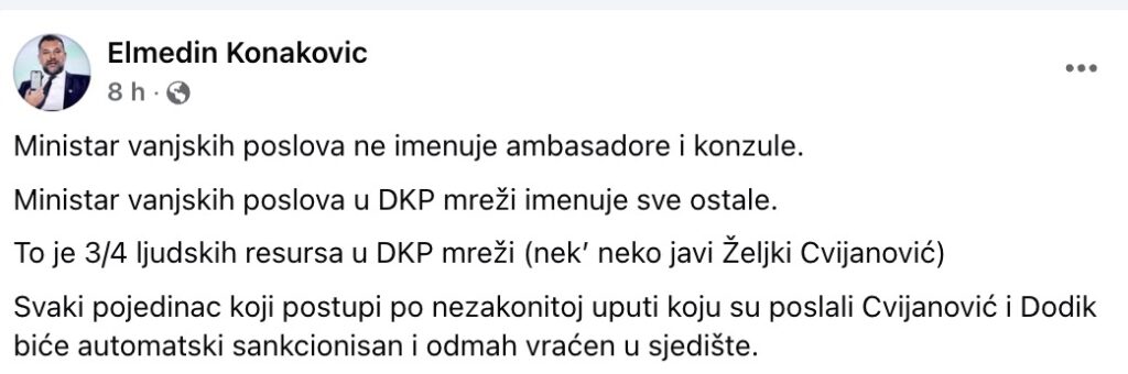 Ministar vanjskih poslova Bosne i Hercegovine, Elmedin Konaković, reagovao je na izjavu predsjedavajuće Predsjedništva BiH, Željke Cvijanović, i najavio sankcije svima koji postupaju prema nezakonitoj uputi koju su poslali ona i član Predsjedništva BiH, Milorad Dodik.