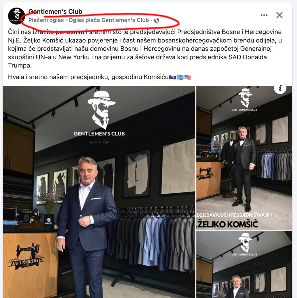 Reklama koja se širi društvenim mrežama saopštava kako je “predsjedavajući Predsjedništva BiH Nj.E. Željko Komšić ukazao povjerenje i čast bosanskohercegovačkom brendu odijela, u kojima će predstavljati BiH na Generalnoj skupštini UN-a u New Yorku i na prijemu kod predsjednika SAD-a Donalda Trumpa”.