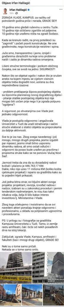 Osim toga, premijer upućuje samopohvale i na račun objekata Kampusa Univerziteta u Tuzli, koji se gradi već više od deset godina, a čijem se završetku ne nazire kraj. Istovremeno, broj studenata na Univerzitetu u Tuzli u posljednjih deset godina prepolovljen je, uz nastavak trenda smanjenja.