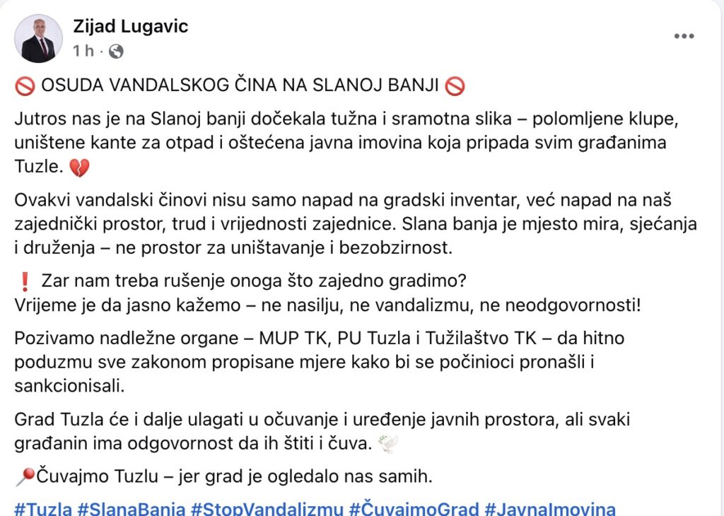 Jutros je Slana banja, jedno od najpoznatijih i najposjećenijih mjesta u Tuzli, osvanula u tužnom i sramotnom prizoru. Polomljene klupe, uništene kante za otpad i oštećena javna imovina dočekali su građane koji svakodnevno posjećuju ovo simbolično gradsko šetalište.