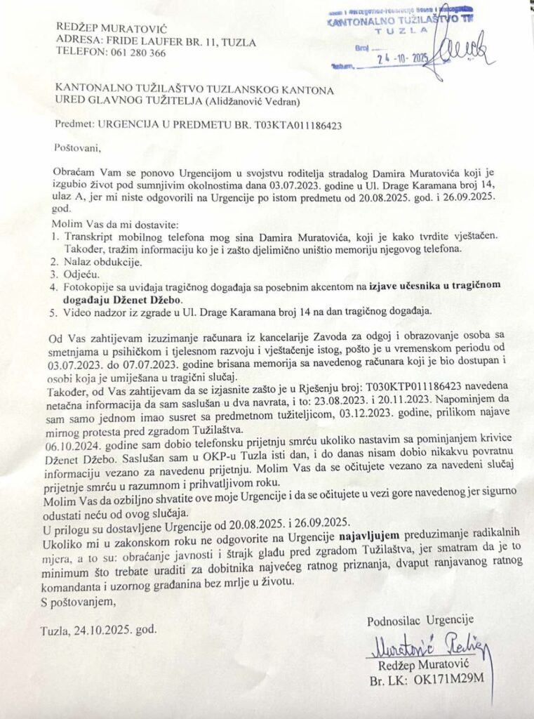 Obraćam Vam se ponovo Urgencijom u svojstvu roditelja stradalog Damira Muratovića koji je izgubio život pod sumnjivim okolnostima dana 03.07.2023. godine u Ul. Drage Karamana broj 14, ulaz A, jer mi niste odgovorili na Urgencije po istom predmetu od 20.08.2025. god. i 26.09.2025. god.