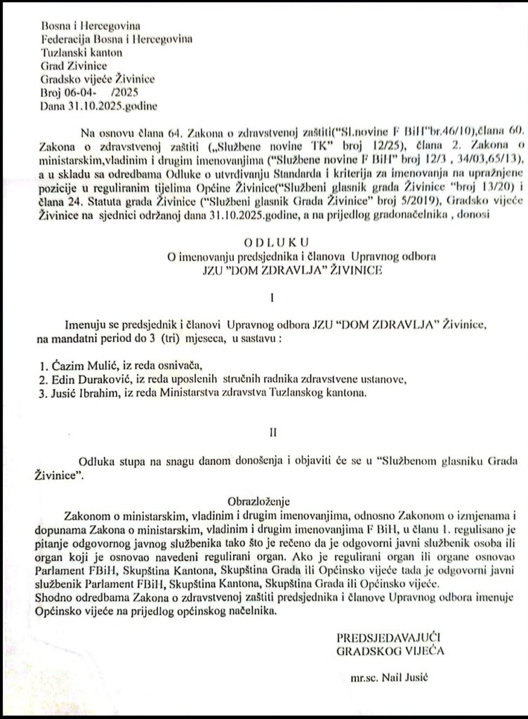 Na posljednjoj sjednici Gradskog vijeća Živinice, održanoj 31. oktobra, donijeta je odluka o imenovanju privremenog Upravnog odbora Doma zdravlja Živinice. Na prvi pogled, riječ je o uobičajenoj odluci, ali se ubrzo ispostavilo da iza nje stoji priča koja je potresla lokalnu javnost.