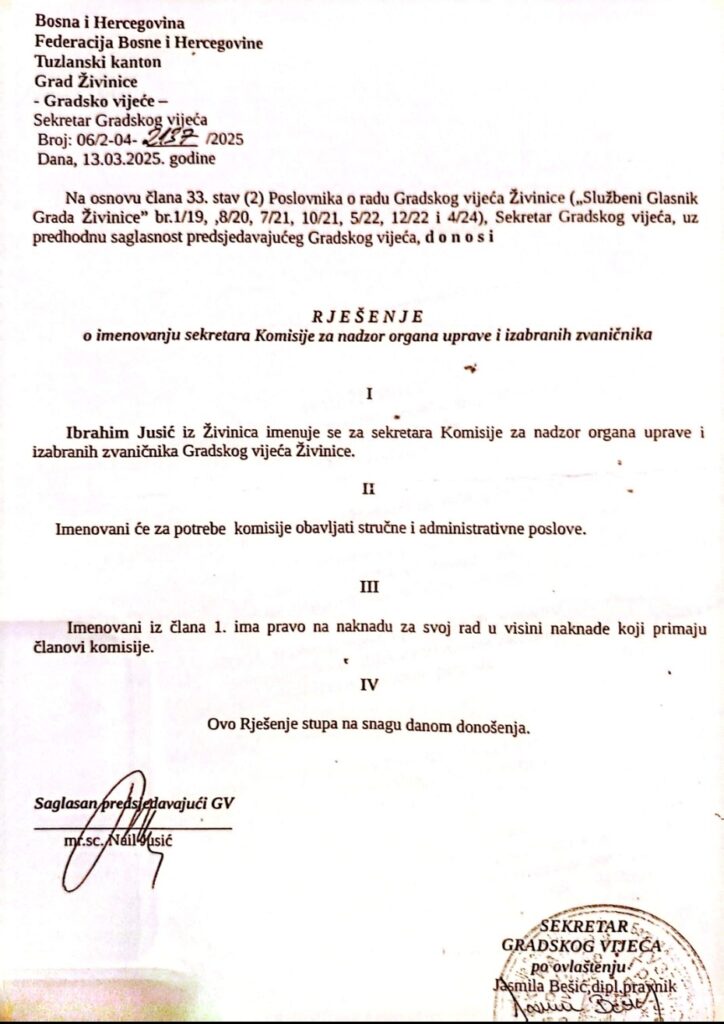Nije ovo prvi put da je Ibrahim Jusić dobio javnu funkciju. Prema rješenju od 13. marta 2025. godine, on je već ranije imenovan za sekretara Komisije za nadzor organa uprave i izabranih zvaničnika Gradskog vijeća Živinice, i to sa mjesečnom naknadom od oko 620 KM. Rješenje je potpisao upravo njegov otac, Nail Jusić – bez potrebe za odlukom vijeća.