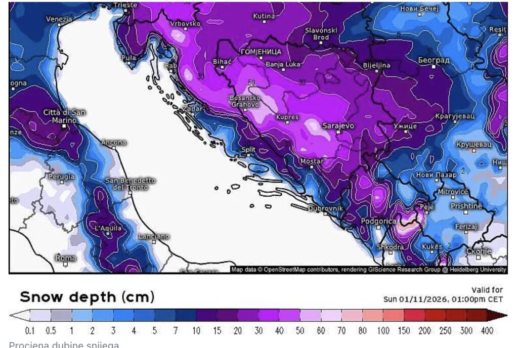 Od srijede se očekuje dodatno pogoršanje vremenskih prilika, uz snijeg širom regije, uključujući i moguće snježne epizode u većem dijelu Hercegovine, zaleđu srednje i južne Dalmacije, kao i u centralnim dijelovima Crne Gore. Istovremeno, Makedonija će, prema trenutnim prognozama, još pričekati na ozbiljnije snježne padavine.