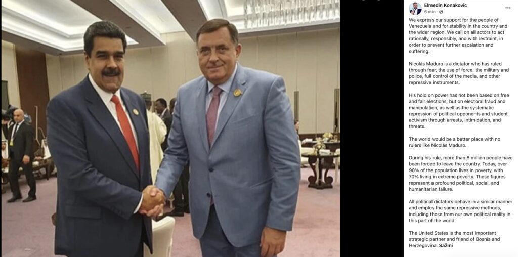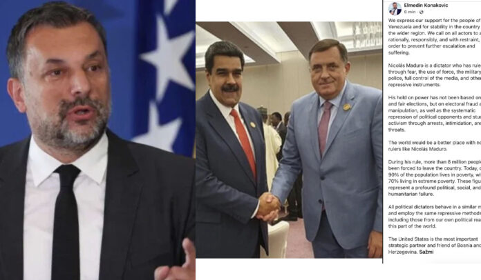 Ministar vanjskih poslova BiH, Elmedin Konaković, oglasio se na svom službenom profilu, i to direktno na engleskom jeziku, pruživši podršku narodu Venecuele, osudivši Madura kao višegodišnjeg diktatora pod čijom je vlašću osam miliona ljudi napustilo Venecuelu, te nazvavši Ameriku strateškim partnerom BiH. Ono što je najzanimljivije u svemu jeste da je Konaković to uradio uz fotografiju Milorada Dodika na kojoj se nalazi s Nicolásom Madurom, a koja se nalazi na službenim stranicama SNSD-a. Time je Konaković direktno bocnuo Dodika na najubojitiji način, koristeći njegovu prevrtljivost i političku dezorijentisanost, u kojoj se više ne zna obraća li se Istoku ili Zapadu. U nastavku prenosimo prevod Konakovićeve poruke: