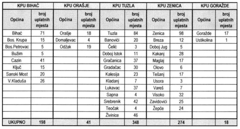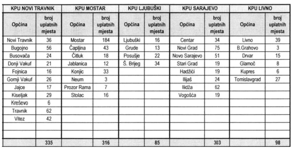 Što se tiče kladionica u Federaciji BiH, najviše uplatnih mjesta ima Tuzlanski kanton – 348. Slijedi Srednjobosanski (SBK) sa 335, Hercegovačko-neretvanski (HNK) 316, Sarajevski kanton (SK) 303, Zeničko-dobojski (ZDK) 274, Unsko-sanski (USK) 198, Hercegbosanski (HBK) 98, Zapadnohercegovački (ZHK) 85, Posavski 41 i Bosansko-podrinjski Goražde (BPK) 18.