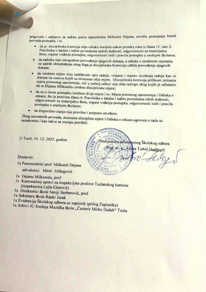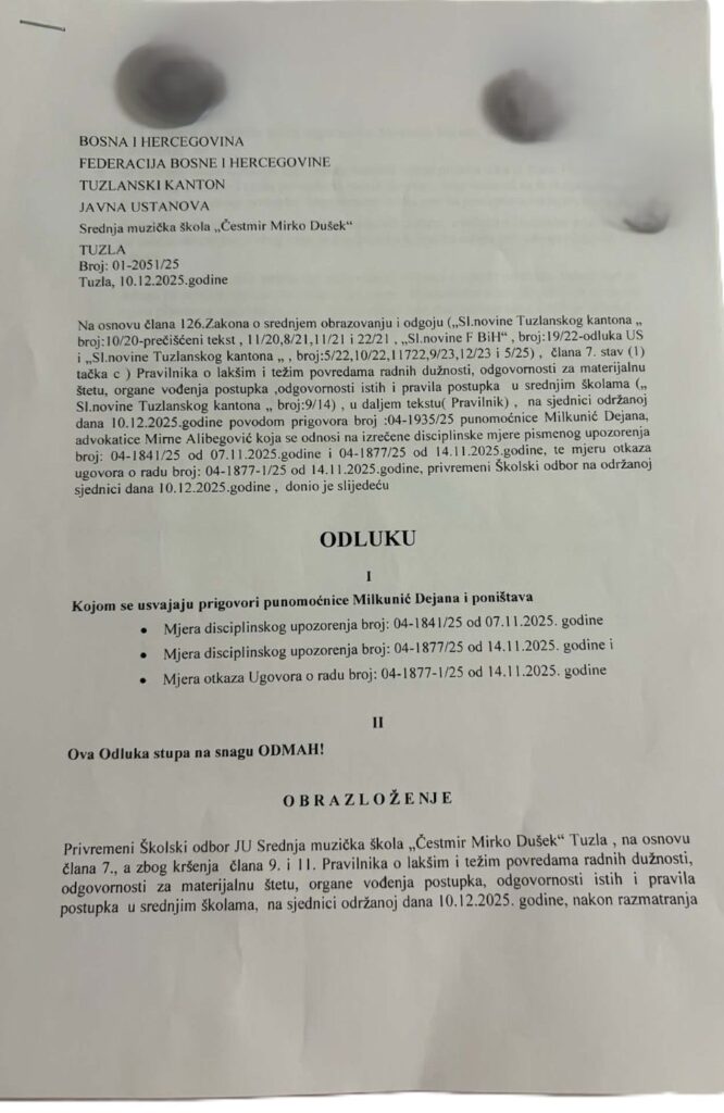 Također demantuju tvrdnje da disciplinski postupci protiv Milkunića nisu utvrdili njegovu odgovornost. Kako navode, Disciplinska komisija JU Srednja muzička škola „Čestmir Mirko Dušek“ Tuzla utvrdila je da je Dejan Milkunić počinio teže povrede radne obaveze, i to u vezi sa prijavama za seksualno uznemiravanje učenica i verbalno vrijeđanje učenika.